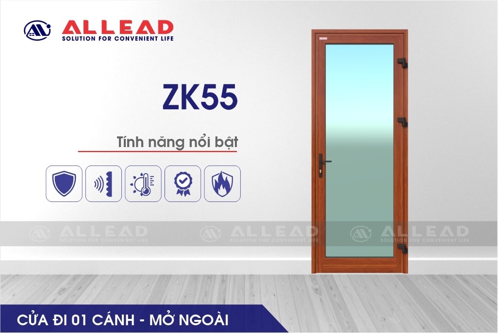 Sản phẩm cửa đi 1 cánh mở ngoài hệ ZK55 do Allead thiết kế và sản xuất có nhiều ưu điểm vượt trội so với các dòng cửa khác. Cụ thể một vài những đặc tính nổi bật của sản phẩm cửa nhôm kính cao cấp hệ ZK55 như: